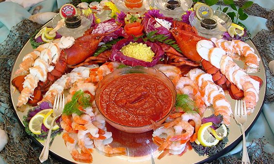 Seafood platters with lobster, crab, and prawns